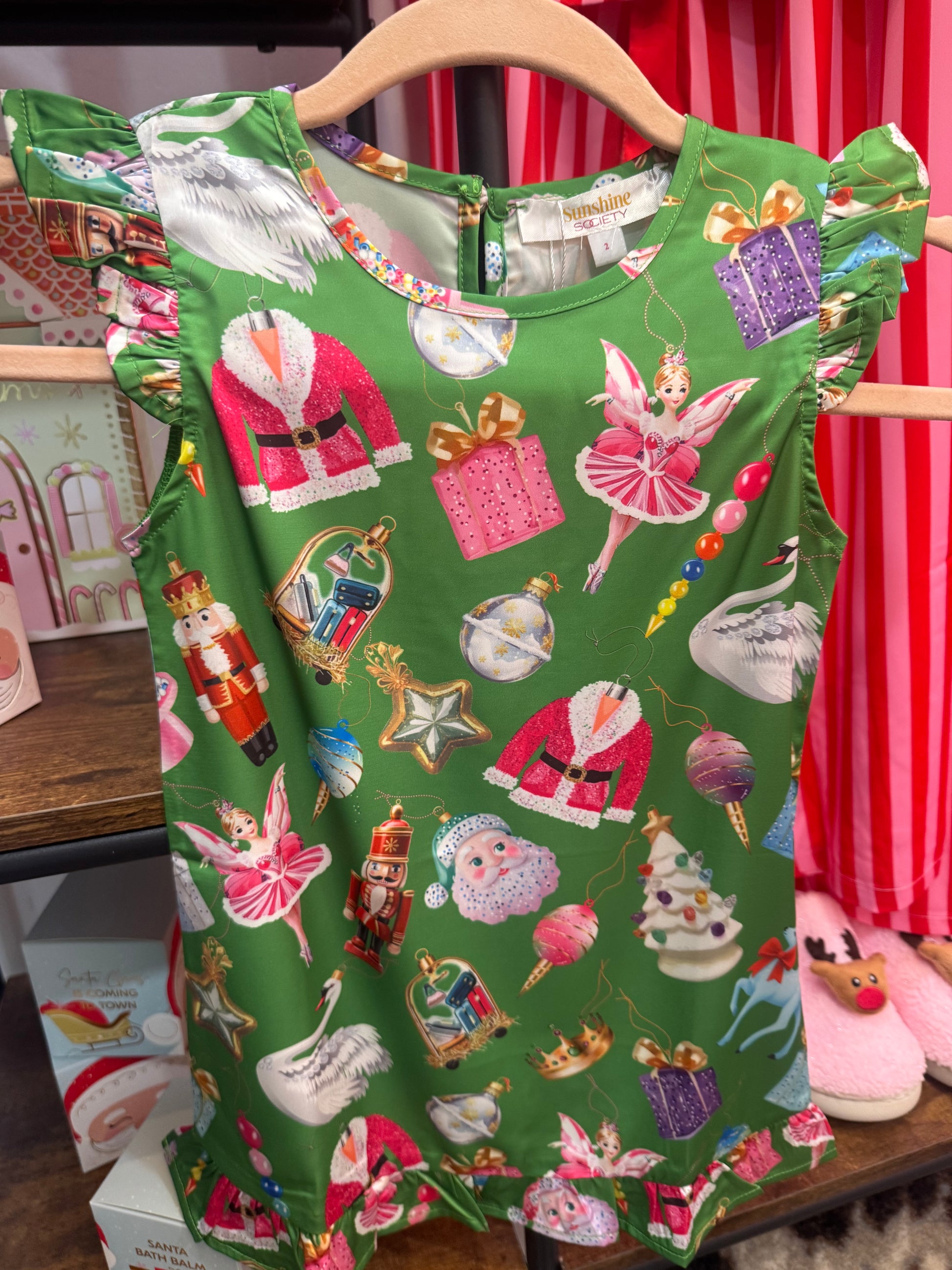 Green satin nightgown featuring a festive Christmas bauble print. 96% poly, 4% spandex