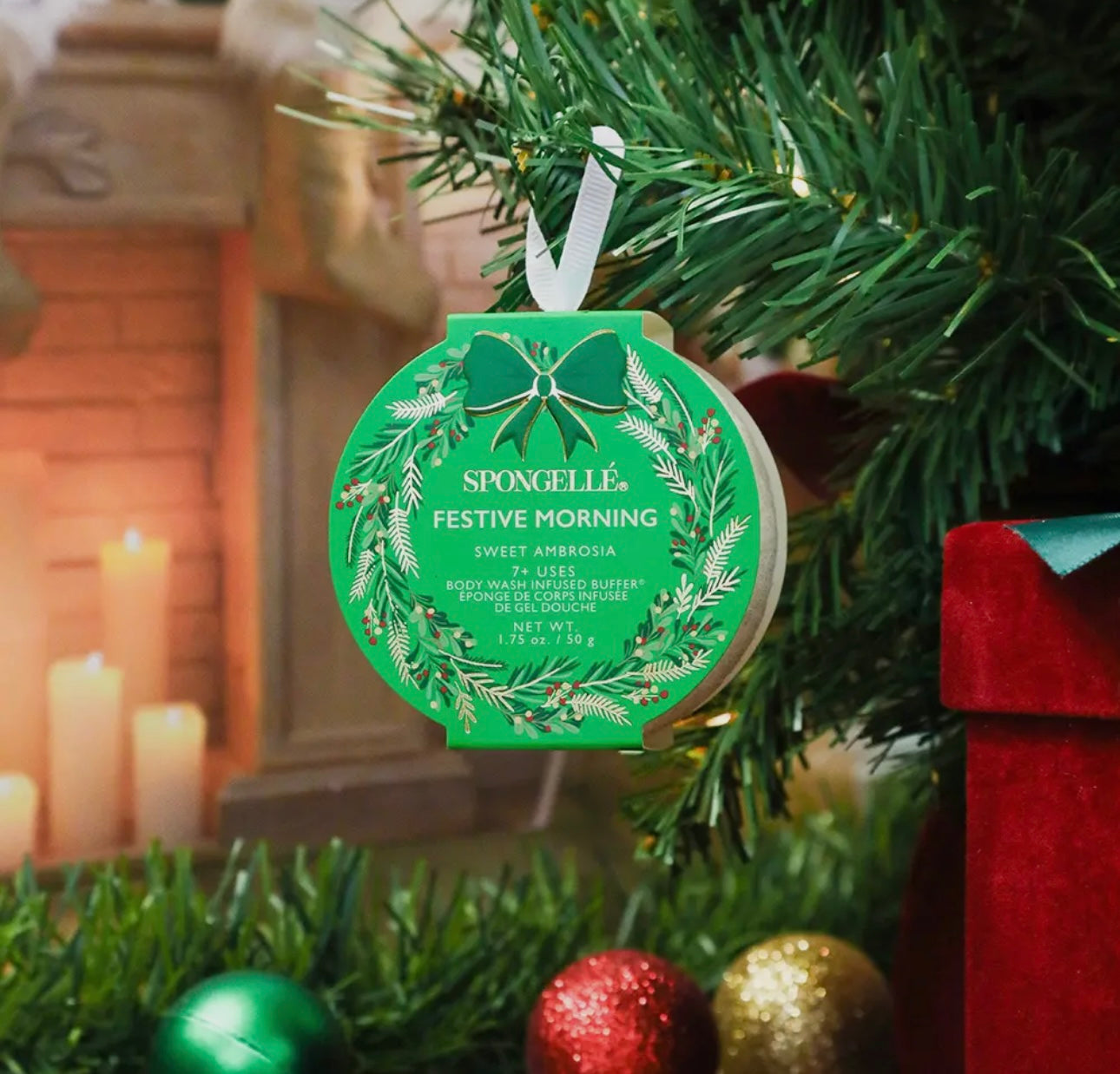 Welcome the season with Spongellé’s® Festive Morning body buffer in Sweet Ambrosia, a luxurious blend of festive charm and high-quality skincare. These beautifully crafted, Holiday Wreath Body Wash Infused Buffers® make perfect ornaments or stocking stuffers, adding elegance to any holiday décor. Each buffer is infused with a rich, long-lasting fragrance and a nourishing formula that not only cleanses and exfoliates but also massages and nourishes the skin, ensuring a pampering experience.