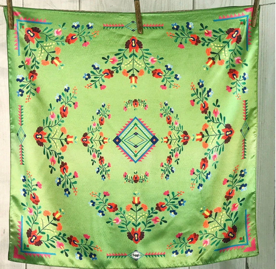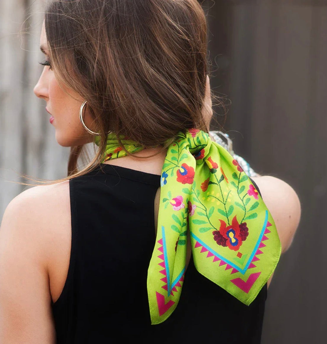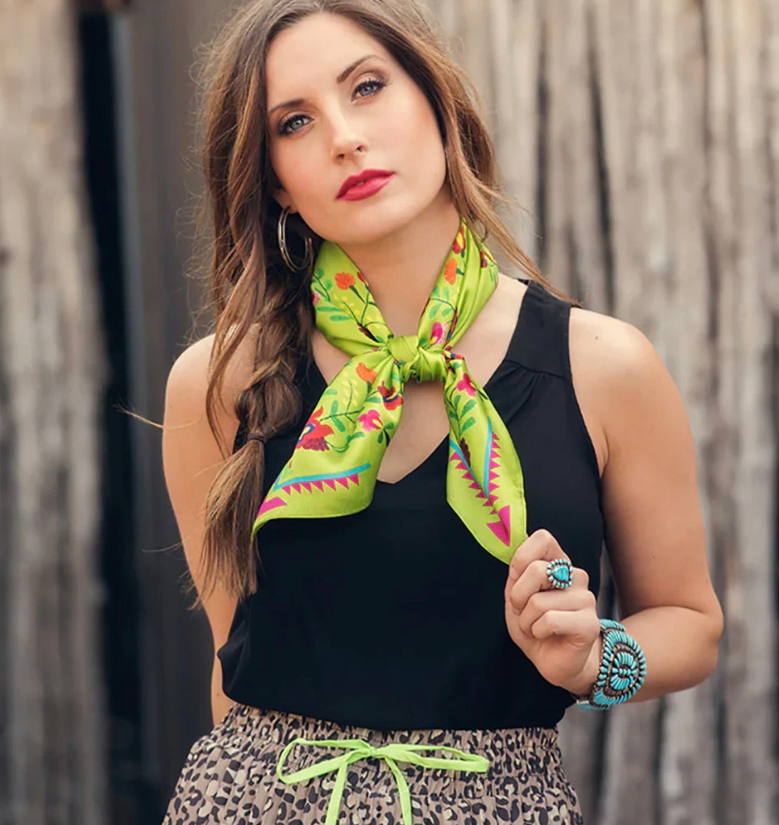 We love this 100% Satin Silk bright, colorful scarf because of it's versatility. Classified as a Shorty in the Fringe line because of it's usable 26x26 size. It's so easy to "tie one on" and make a ho-hum outfit look... well, just better.
