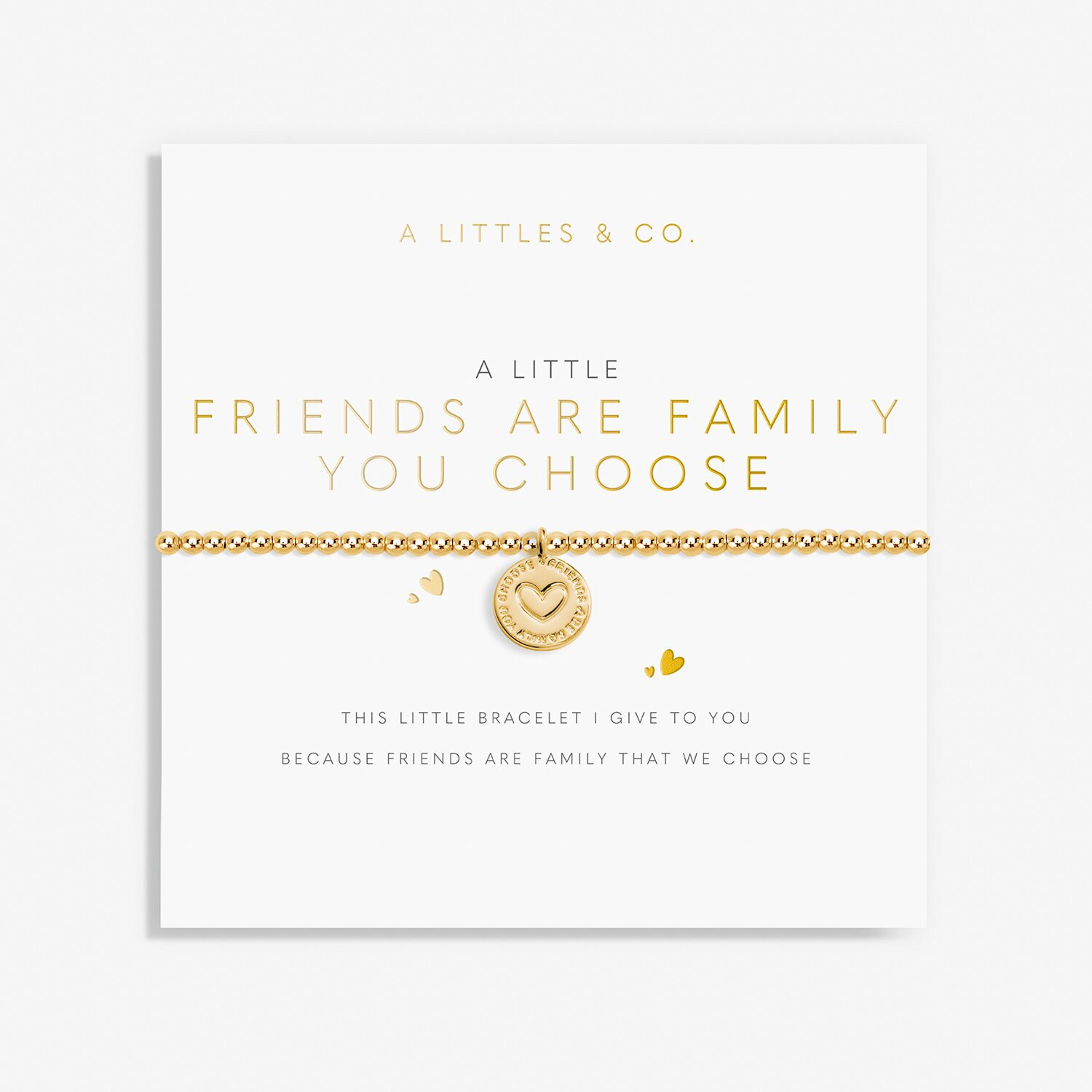 Gift pretty every time with our A Little Friends Are The Family You Choose Bracelet. Created in gorgeous gold-tone plating, this style features a stretch bead design to fit every wrist, and is laced with an adorable engraved circular charm. Presented on a card thats stamped with the sentiment and sweet poem, this bracelet makes for the perfect gift.