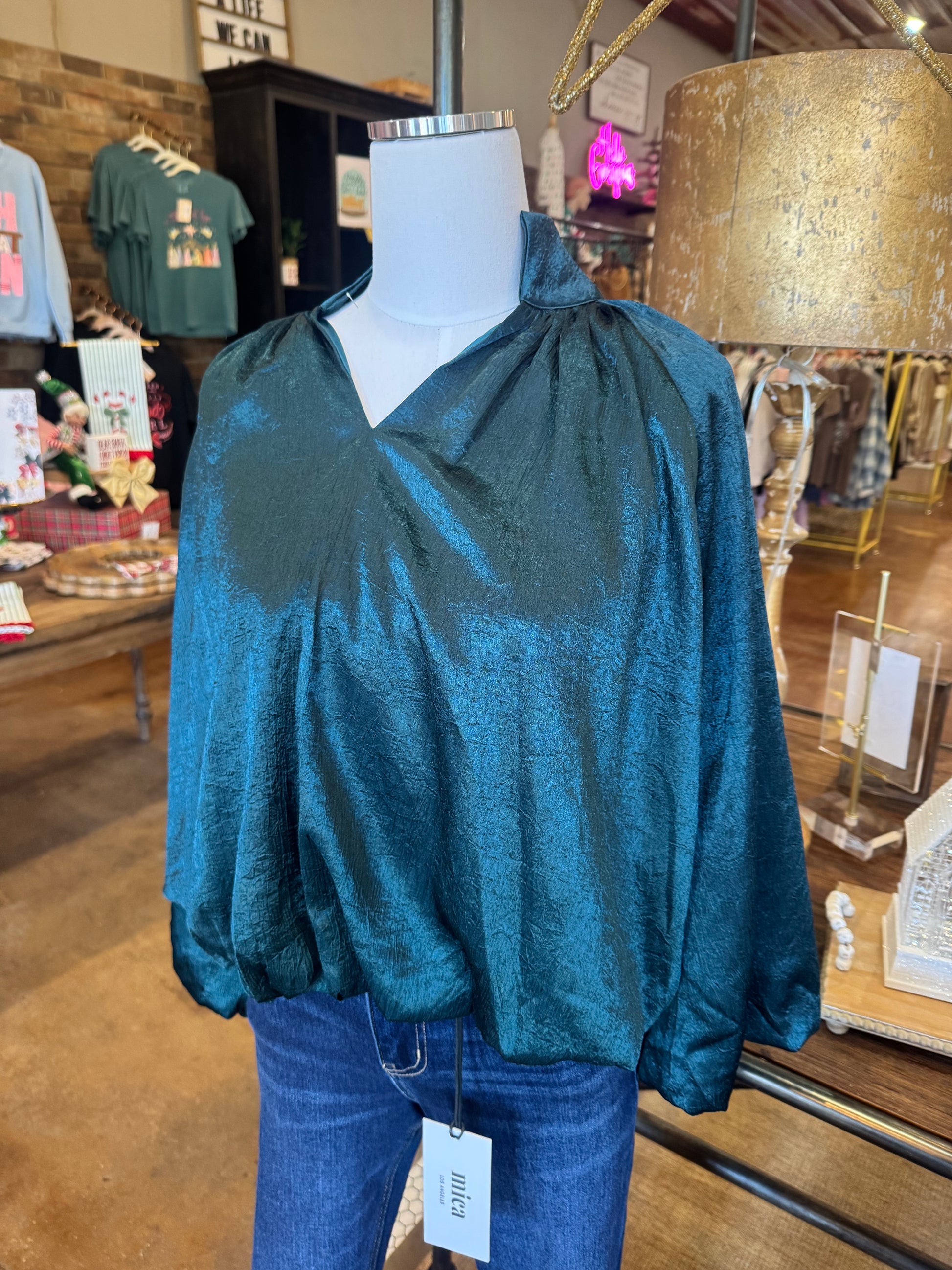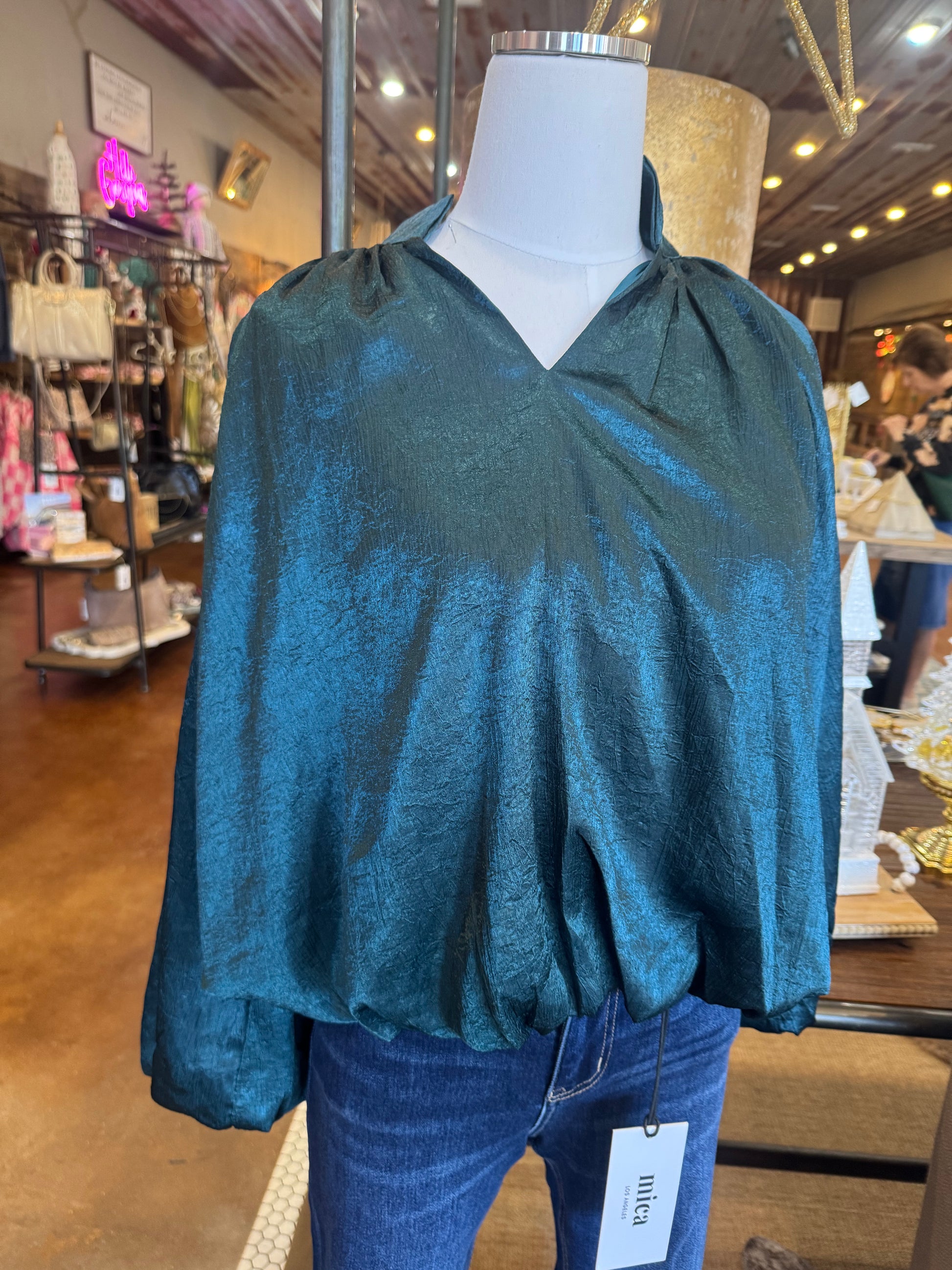Oversize Metallic top perfect for a date night or holiday party! V neck line, bubble sleeve & a bubble hem.
