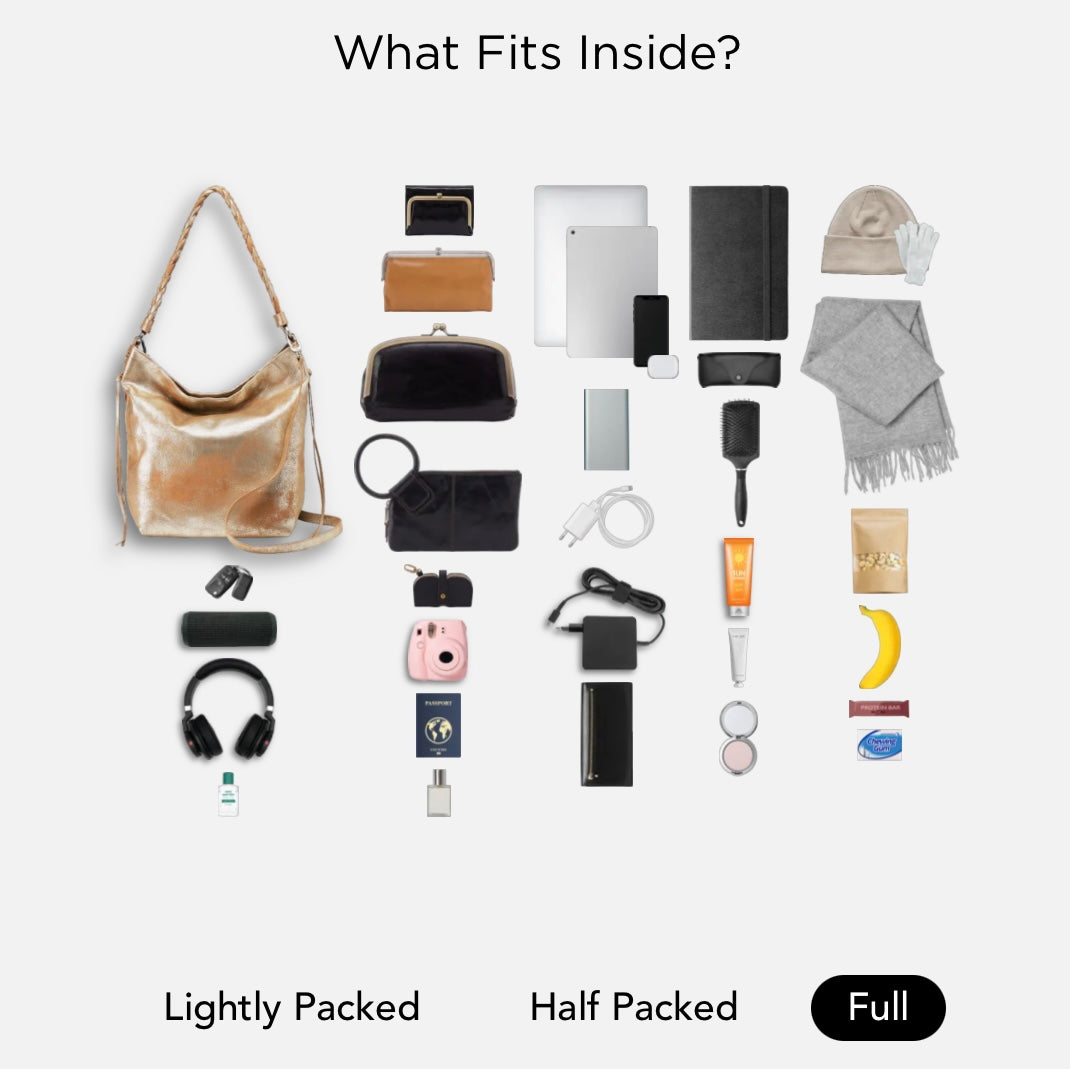 The Lindley HOBO is a timeless hobo-style shoulder & crossbody bag. Magnetic closure & a variety of pockets. Metallic leather & braided details