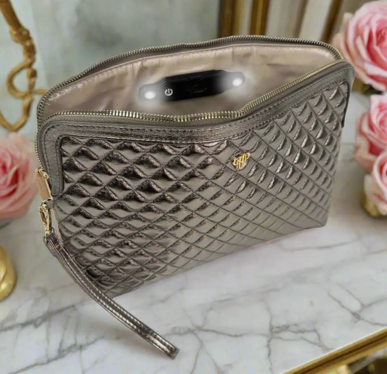 The LITT Makeup Case illuminates your beauty rituals with an amazing built-in LED Light. Ensure you never fumble in the dark looking for your essentials again. This large makeup case has with a detachable wristlet that makes it easy for this case to double as a chic clutch. Seamlessly transition from day to night, effortlessly carrying your keys, lipstick, and even a passport. The design includes a middle divider with a zipper closure that keeps your items securely in place, while the four interior pockets provide a dedicated space for your smaller essentials.