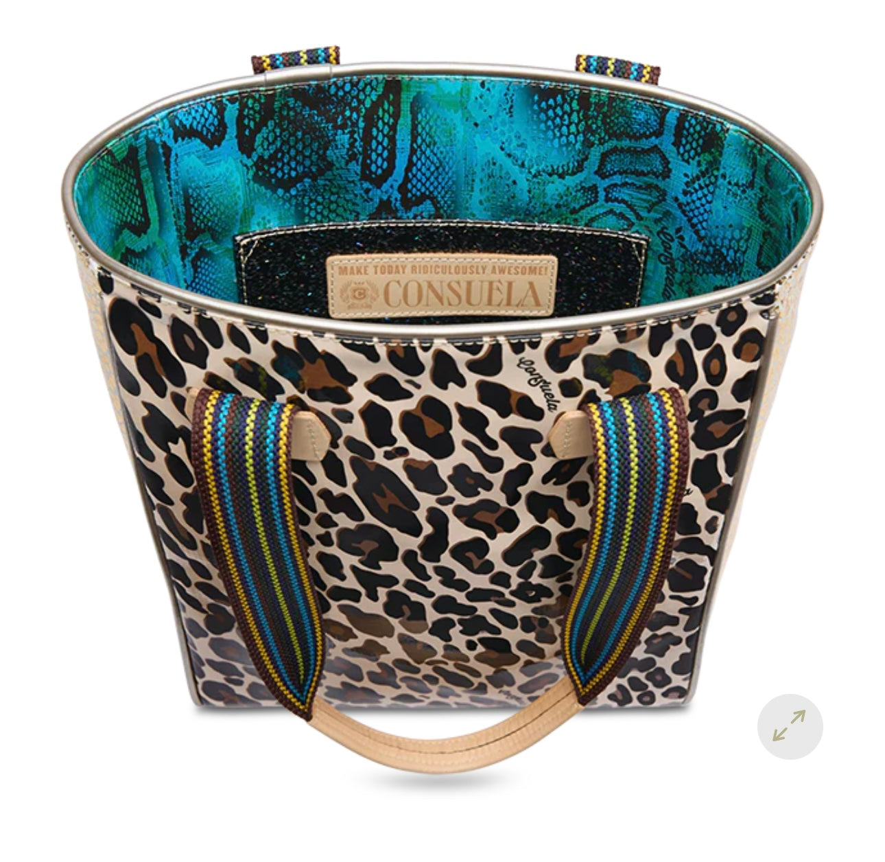 The multifunction Mona Chica Tote by Consuela has comfortable woven handles, a roomy interior w/pockets, and is crafted to hold its shape. Mona ConsuelaCloth exterior and Kit gold foiled leather side panels