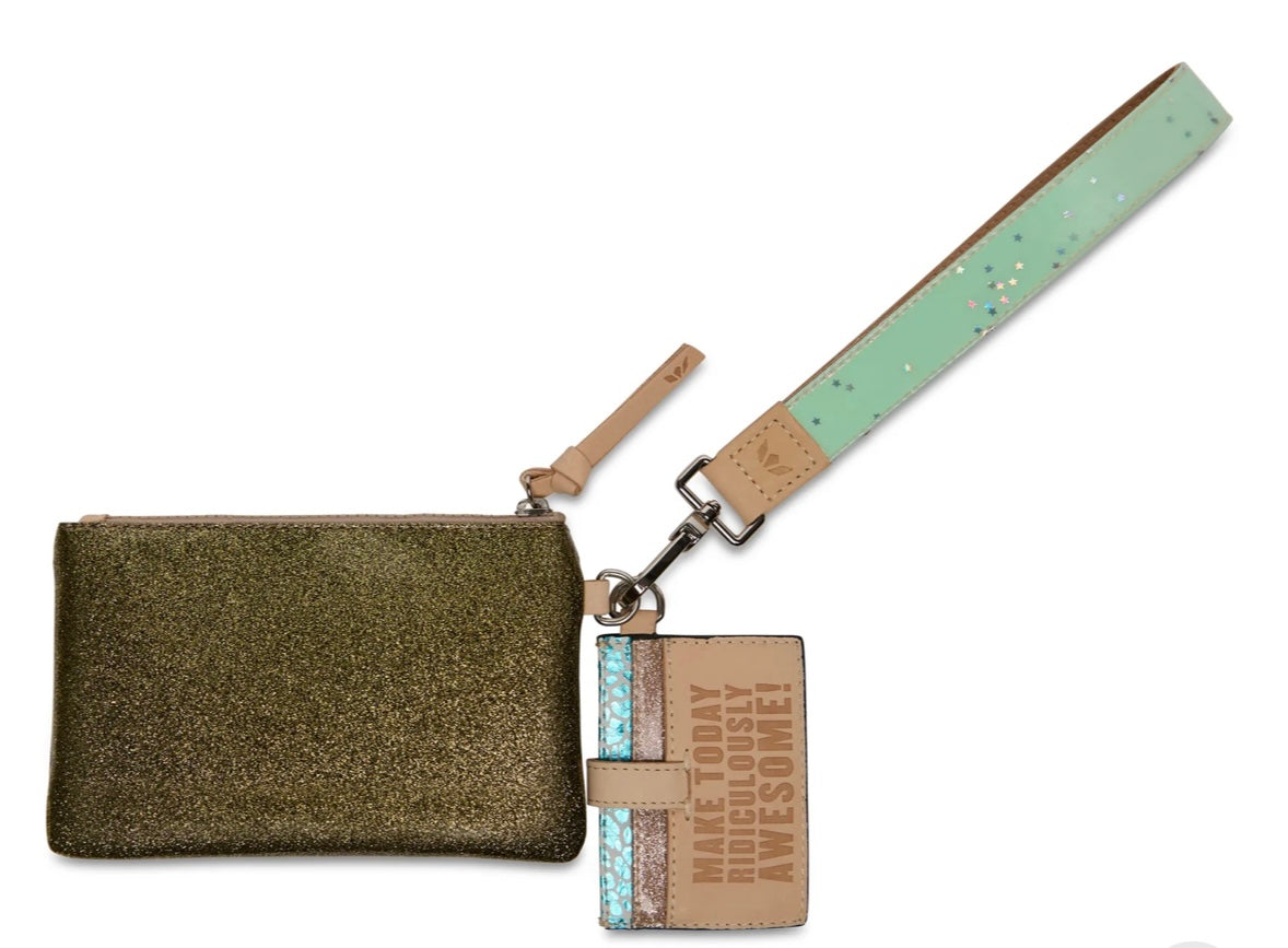 Oly, (olive glitter pattern), wristlet wallet by Consuela includes a pocket pouch, secure card slot wallet, and fits comfortably around your wrist.