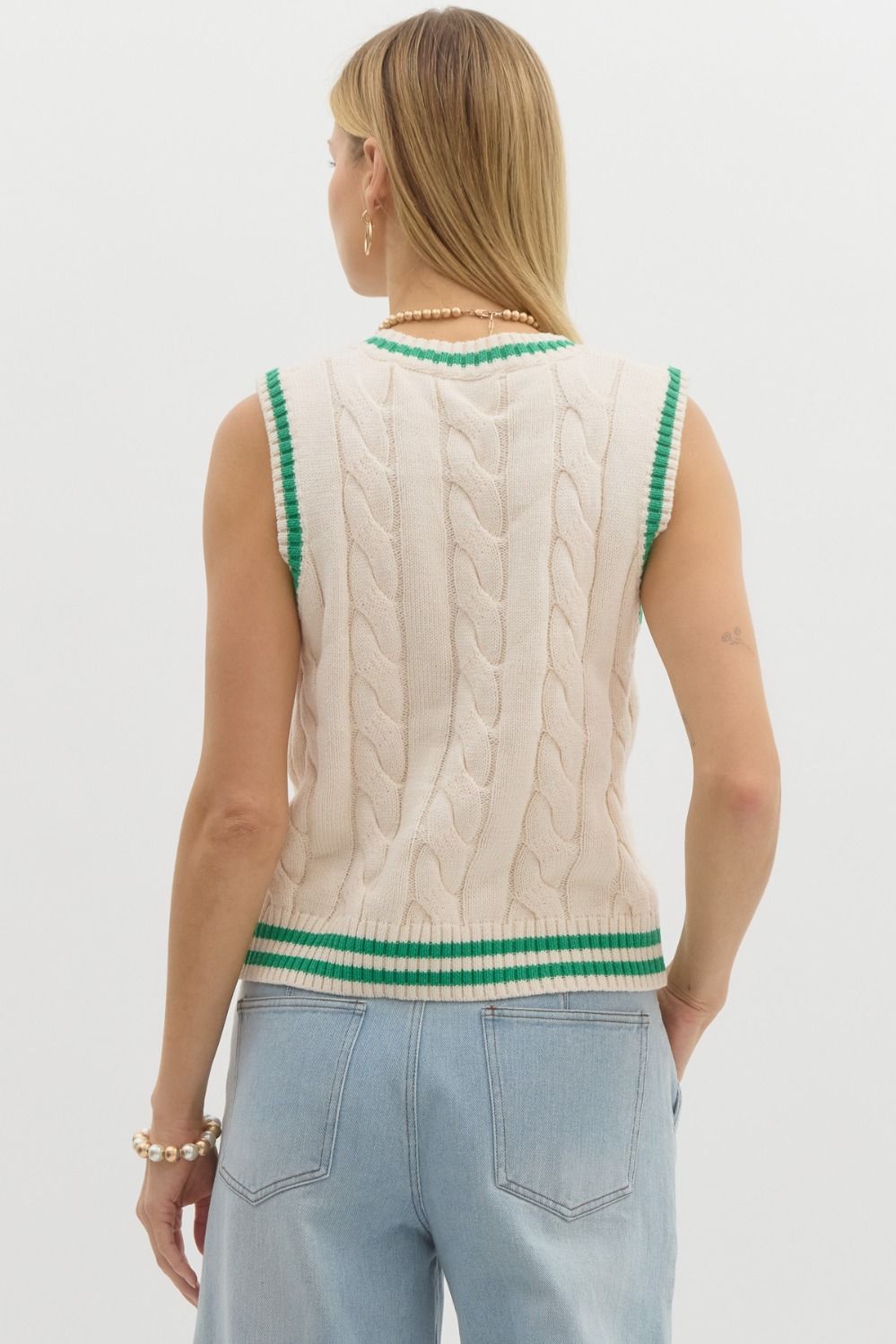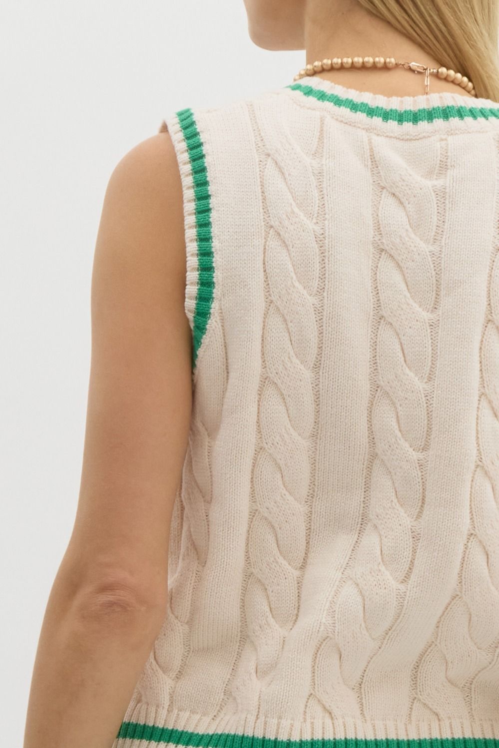 60% COTTON 40% ACRYLIC CREAM RUGBY VEST W/KELLY GREEN STRIPE