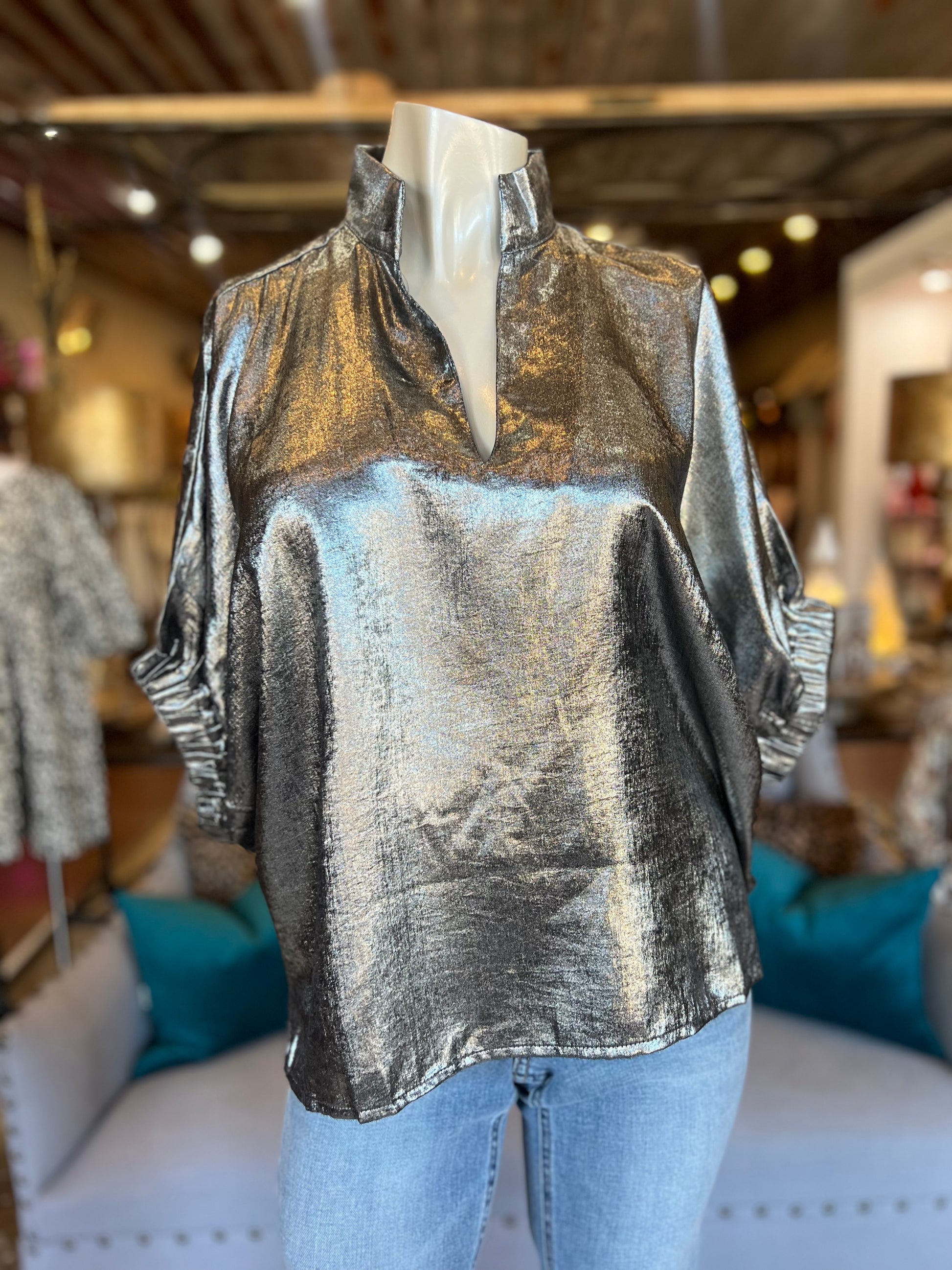 Metallic v-neck top, oversize fit. Dolman sleeves with elastic cuff. Split hemline. Available in regular & curvy sizes.
