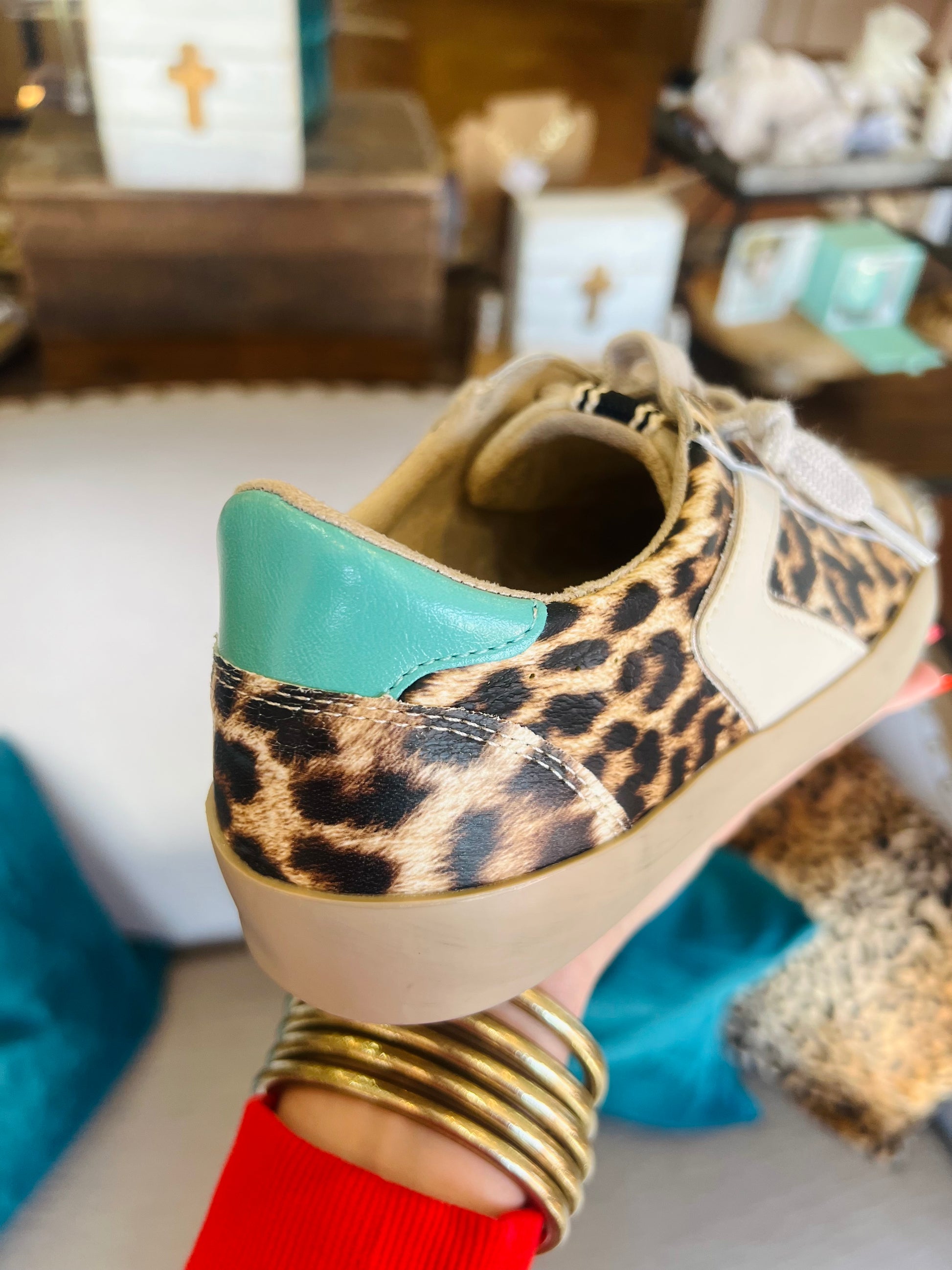 Unapologetically bold. ROBBIE in Leopard Print channels vintage street-style energy with a wild twist. Faux leopard hair, contrast stitching, and a distressed rubber sole give this sneaker instant cool-girl status. Finished with a pop of turquoise on the heel tab and an off-white leather stripe, it’s made for the ones who love to stand out, even when dressed down.