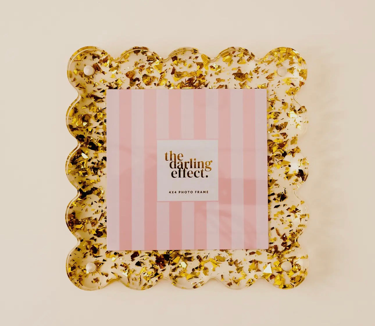 Modern design with scalloped edge Easily update and swap out your favorite photos Magnetized panels for a safe and secure hold Fits 4x4 photos and standard polaroids dims: 5.75”w x 5.75”h