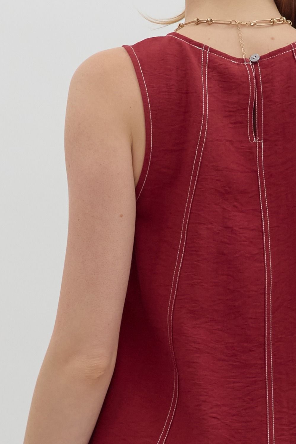 85% RAYON 15% NYLON SOLID SLEEVELESS PULLOVER TANK WITH SWING WAIST FEATURING CONTRAST ACCENTED EXPOSED STITCHING