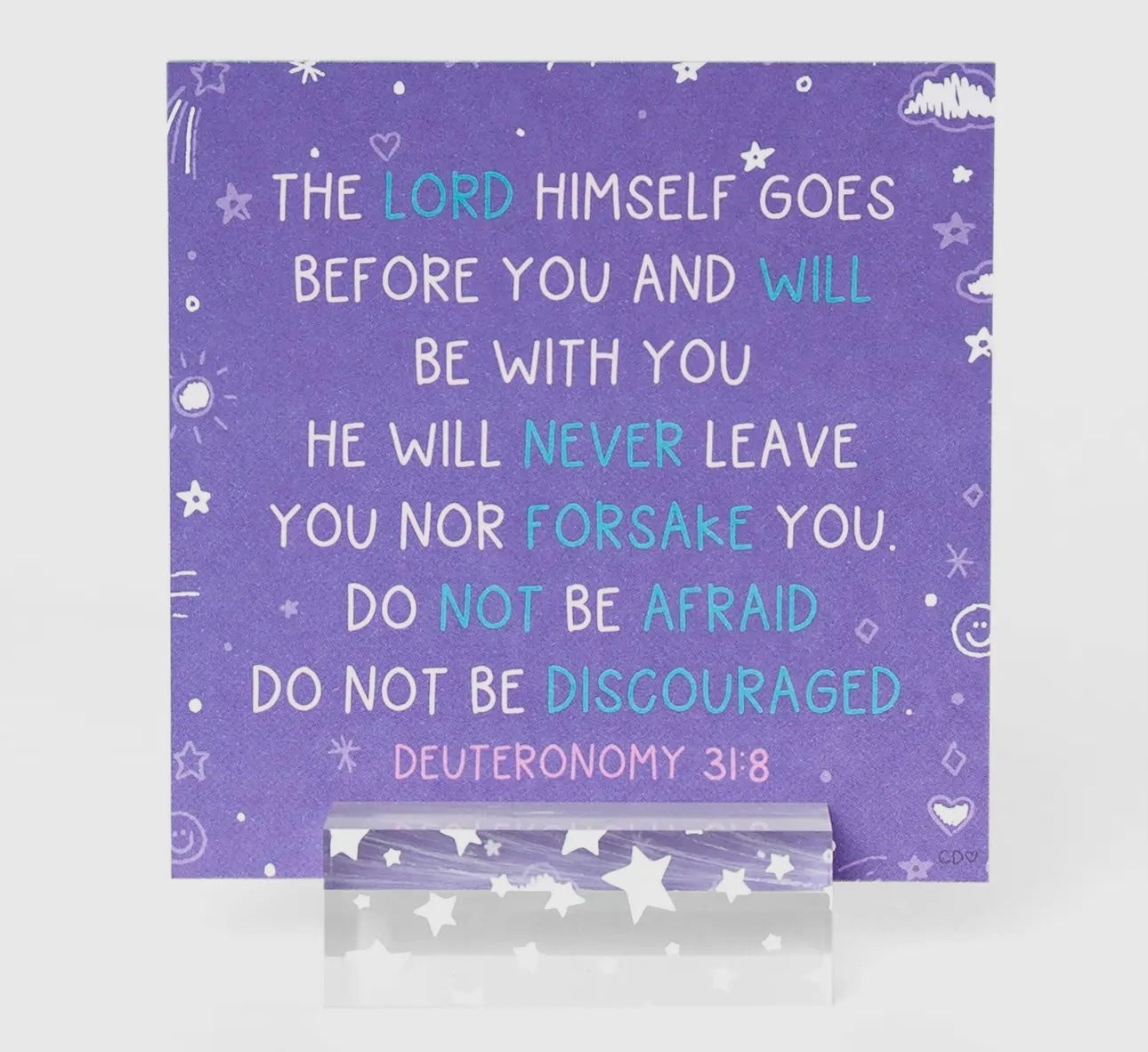 Bring calm and encouragement to your daily routine with the Verses for Peace Bible Verse Card Set. This desktop display includes 24 hand-lettered Scripture cards designed to comfort and uplift, featuring peaceful colors and a built-in stand for easy viewing. Perfect for quiet moments, morning routines, or gifting to friends, teachers, and loved ones who could use a little extra peace. Display on your desk, nightstand, or kitchen counter as a daily reminder of God’s presence and promises. A thoughtful and faith-filled gift for any season of life.